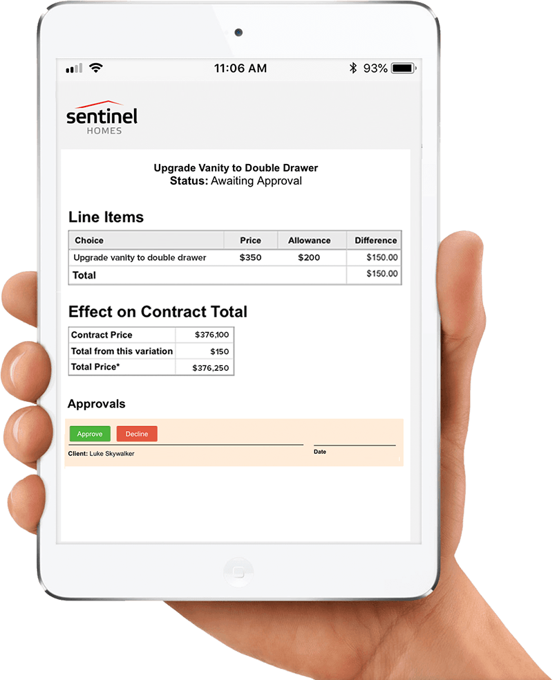When you build your new home with us, you’ll also get access to the Sentinel App. That’s where you get to see everything that’s going on with your build, on desktop or mobile. You’ll get to check in on the items, upgrades, financial decisions you’ve made, and important documents. You’ll also be able to chat with your project manager and see progress photos. It’s like being on site, without having to actually leave the house (or put on pants).