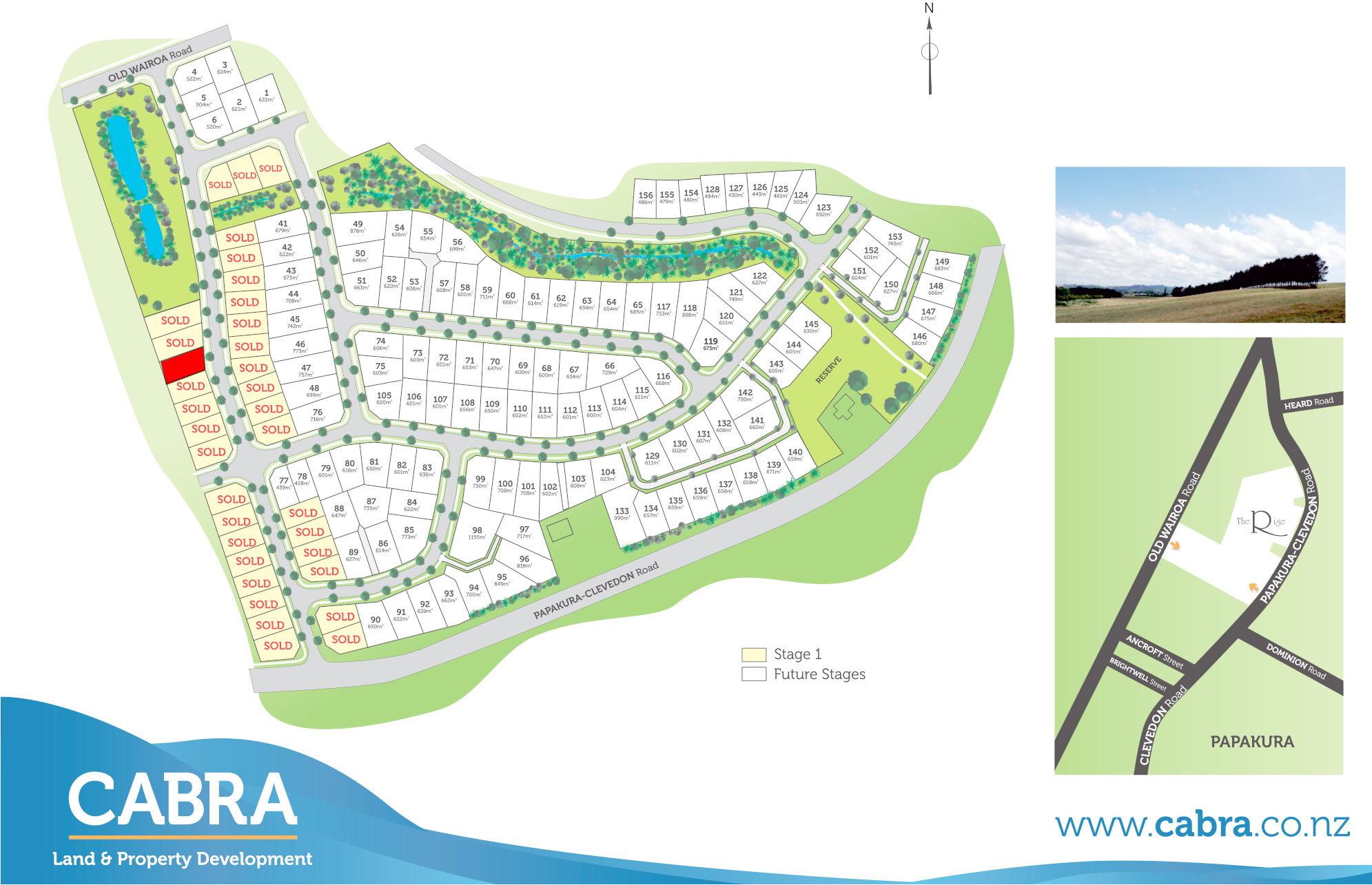 The Rise has the perfect mix of town & country living situated on the outskirts of Papakura, just off the Papakura-Clevedon Rd. The development will consist of 156 sections of mixed sizes to encourage creative architectural design. The Reserve, Stormwater pond and greenfinger/stream will be extensively planted with natives to enhance the rural aspect and provide attractive recreational spaces. The larger reserve bordering the Papakura/Clevedon Rd was the site of Ring’s Redoubt, Kirikiri and has historical value to the area. The Southgate Shopping Centre, Papakura Township with Supermarkets, Library, Theatre, Museum & Aquatic Centre are within easy access. Papakura also boasts some great parks with the Bruce Pulman Park Outdoor Sports & Recreation Centre just a short drive away. Contact us now and find out more about this exclusive house & land package! You can use the plan we have designed or design your dream home. Covenants ensure quality builds with elevated views. 30km from Auckland CBD.
