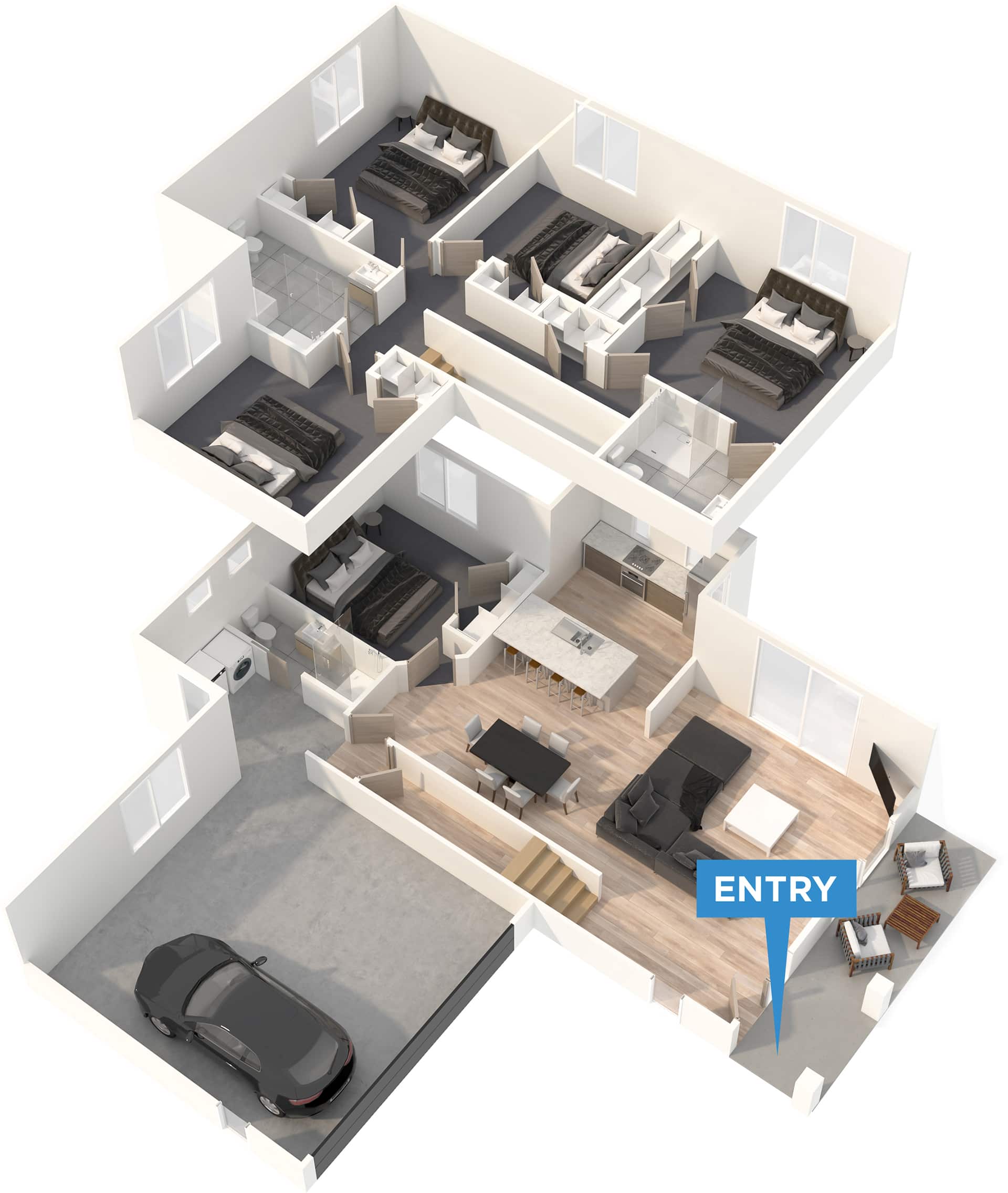 An ideal family home. A covered entrance opens onto a spacious open-plan kitchen, dining and living area, perfect for family get-togethers, with a first level reserved for four well-sized bedrooms and two bathrooms, with another bathroom and bedroom downstairs.