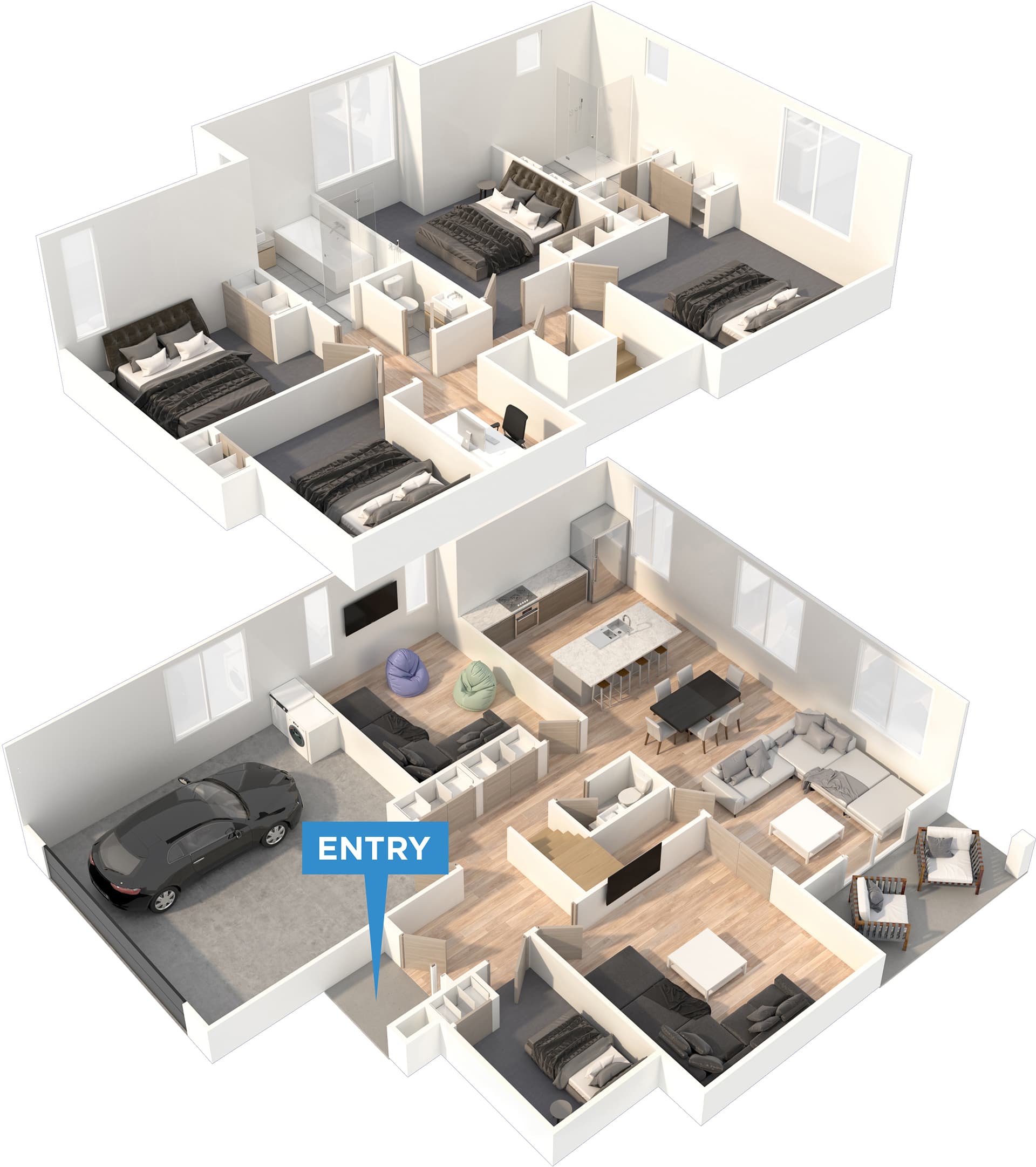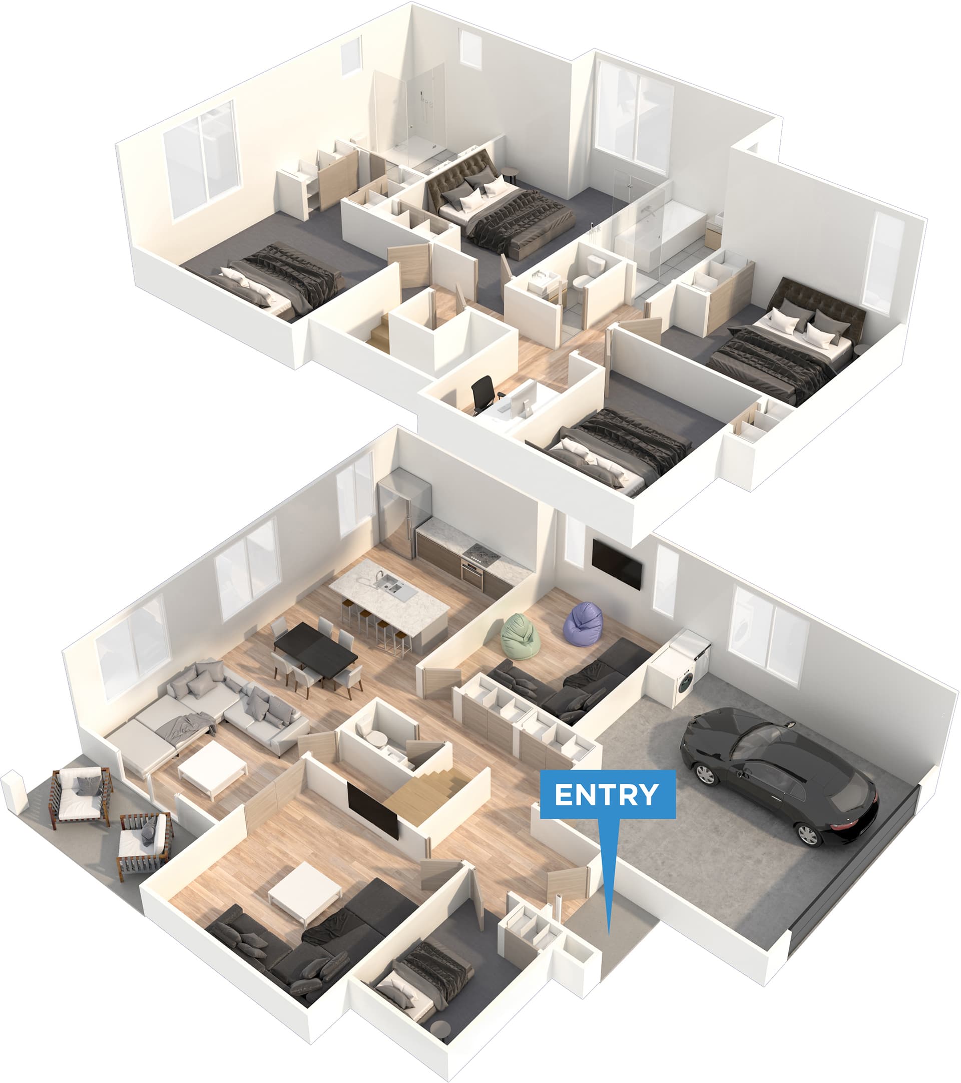 A classic family home with well-arranged living and bedroom spaces. Charlize features four bedrooms on the upper level with an open-plan living, dining and kitchen area downstairs, perfect for entertaining. The double garage and outdoor patio add the finishing touches to a family gem.