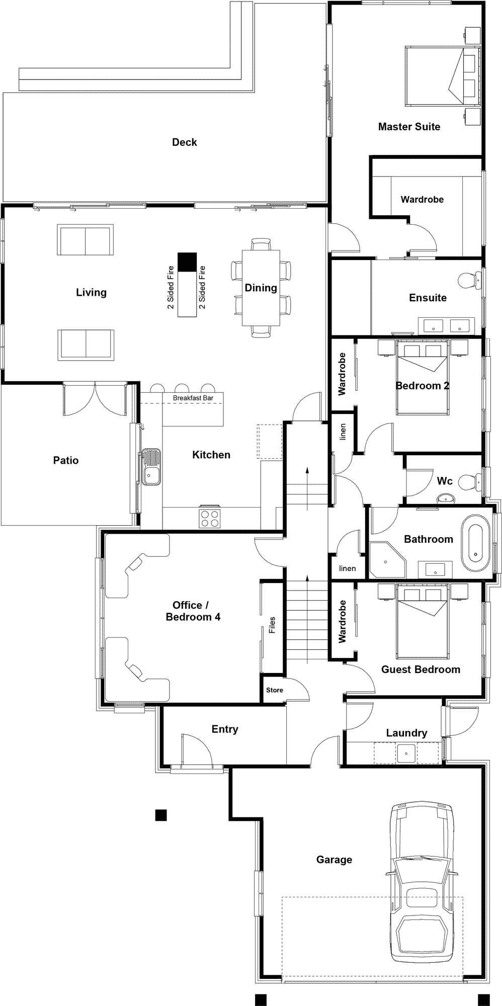 Spacious design across two levels make this home perfect for family living on a sloping site. Features double garage, patio and well-designed kitchen, dining and living area. The four bedrooms include a master suite with ensuite and walk-in wardrobe.