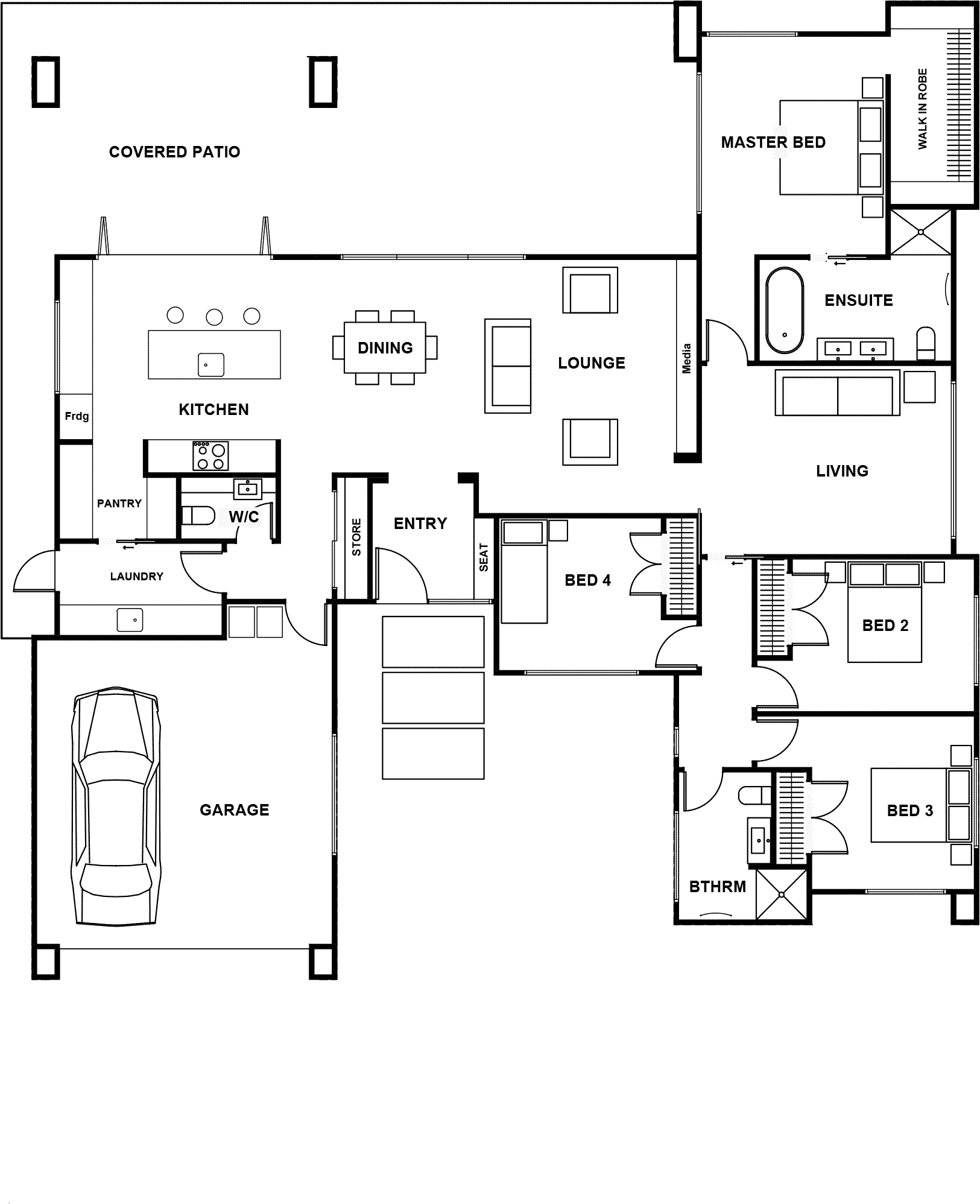 We like this design so much we're building a showhome in Taranaki to these plans. A spacious home with open plan living and dining. The master, with its generously sized ensuite and walk in wardrobe is separated from the kids rooms by a family lounge.