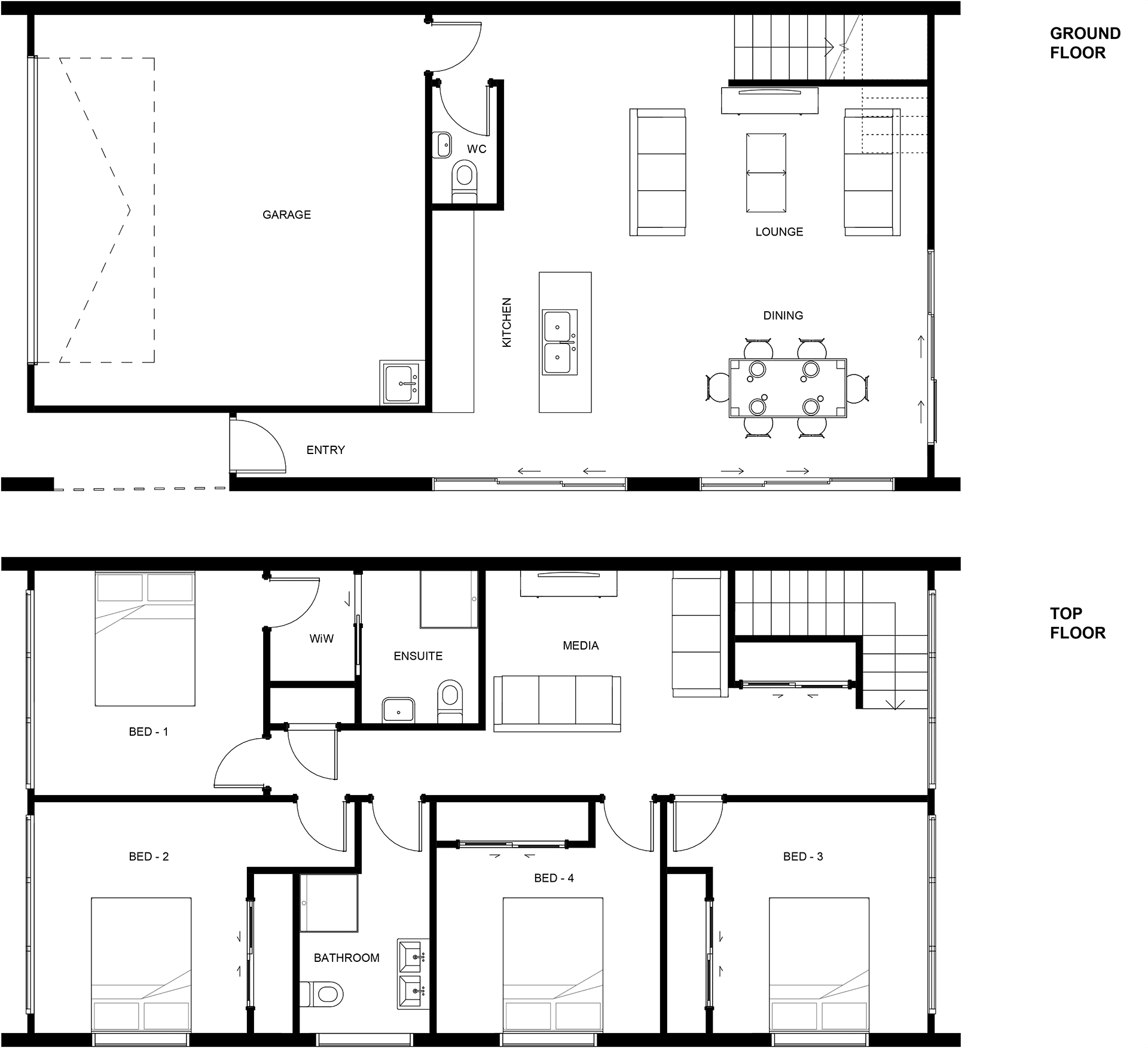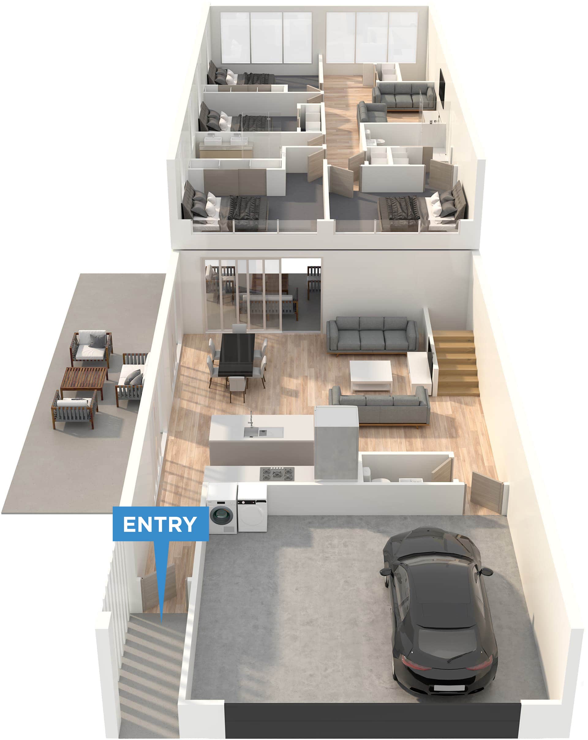 A fantastic two storey home on a small footprint. This design can also be used as a single home, or repeated as two townhouses.