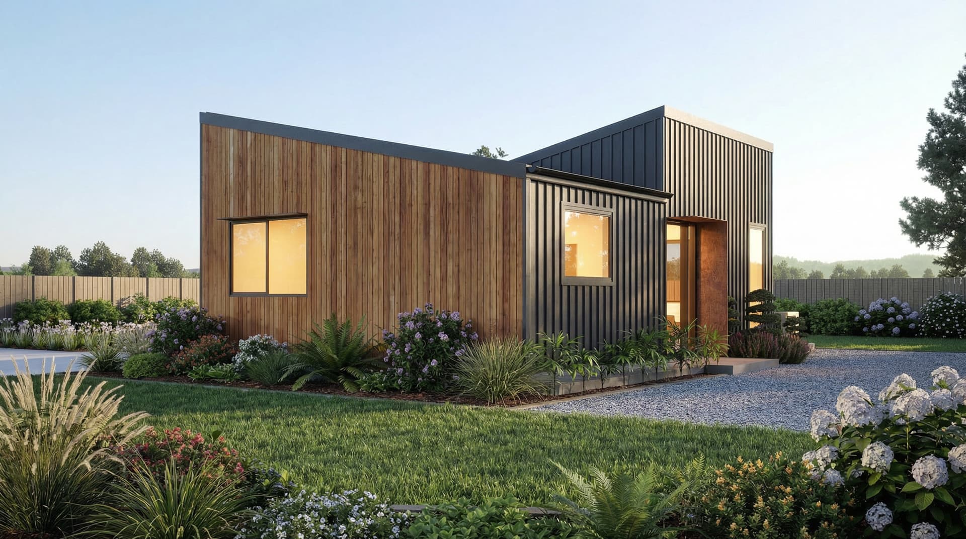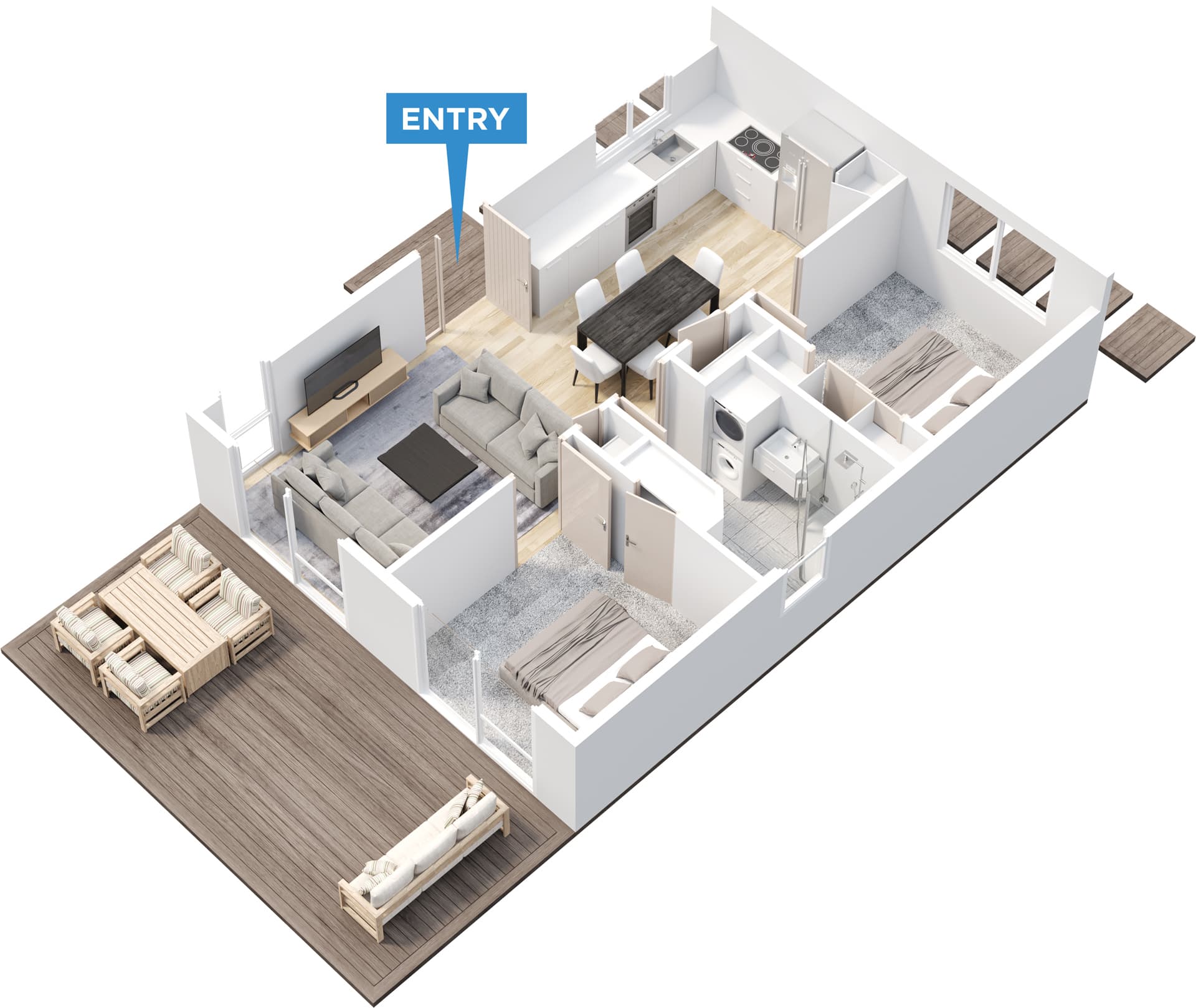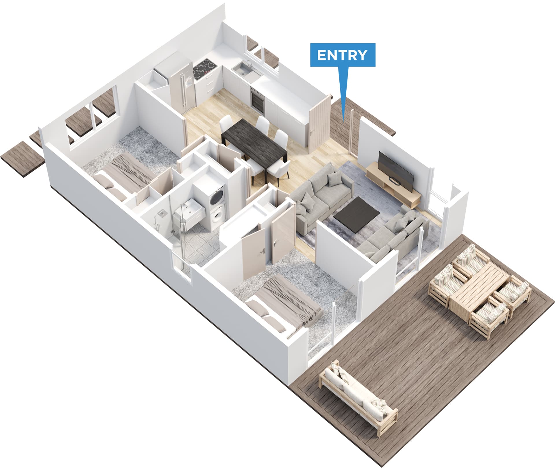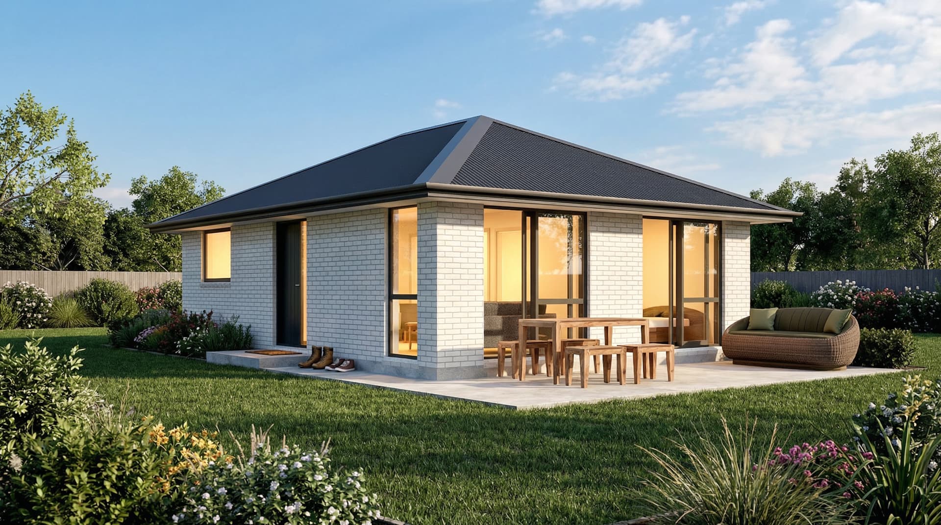 A smart, compact two-bedroom minor dwelling designed for easy living, with a central open-plan layout.