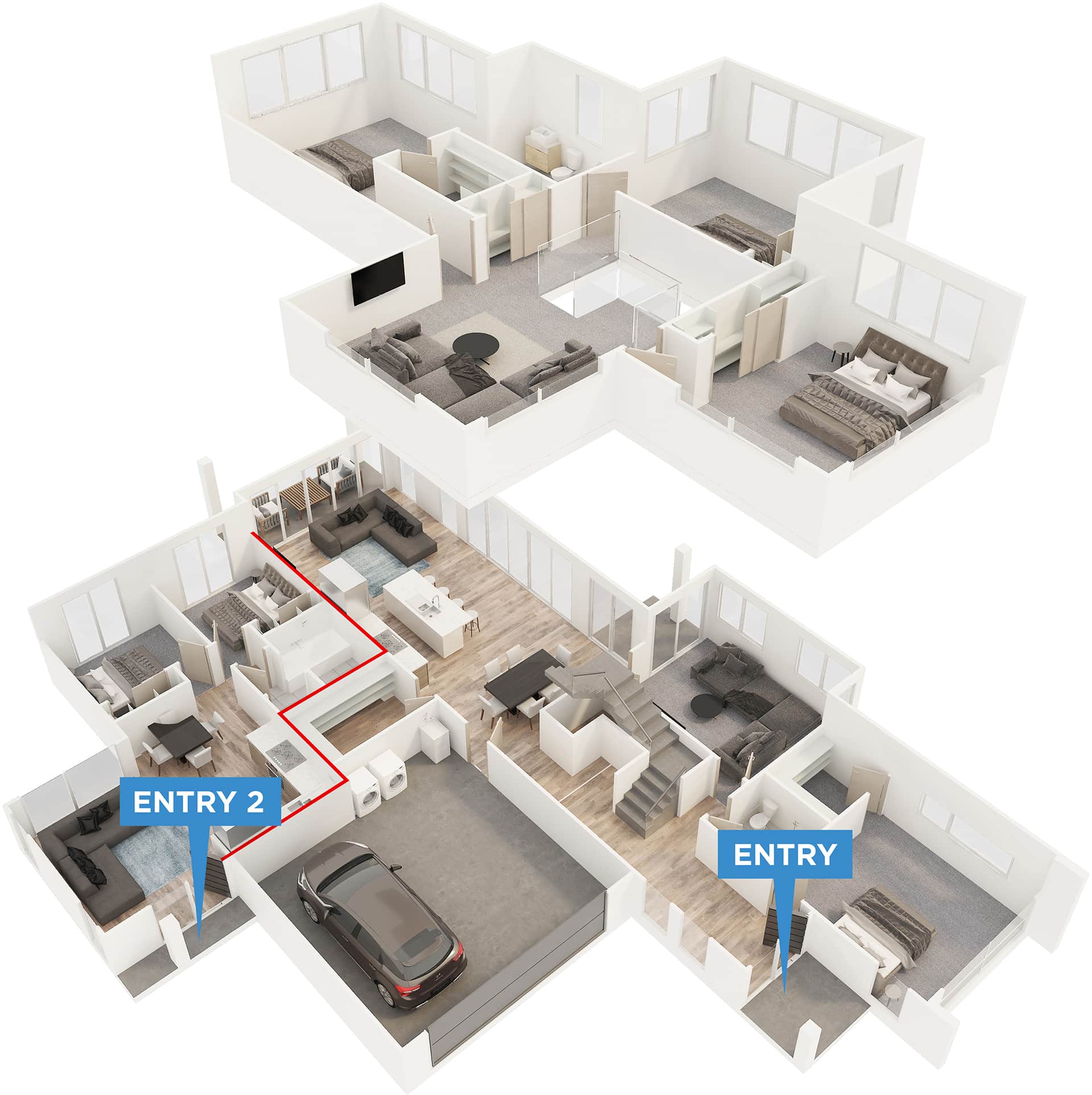 This home design combines the perfect family home with a great income opportunity. Situated on one side of the ground floor is an open-plan kitchen-dining-living area, opening into an outdoor courtyard with a double bedroom, large bathroom, separate lounge area and double garage at the rear of the house. A staircase to the upper level which includes three spacious bedrooms, large bathroom and another living space completes the family home. The ground floor is flanked by the secondary dwelling consisting of two spacious bedrooms, open-plan kitchen-dining-living area, large bathroom and space for outdoor parking.